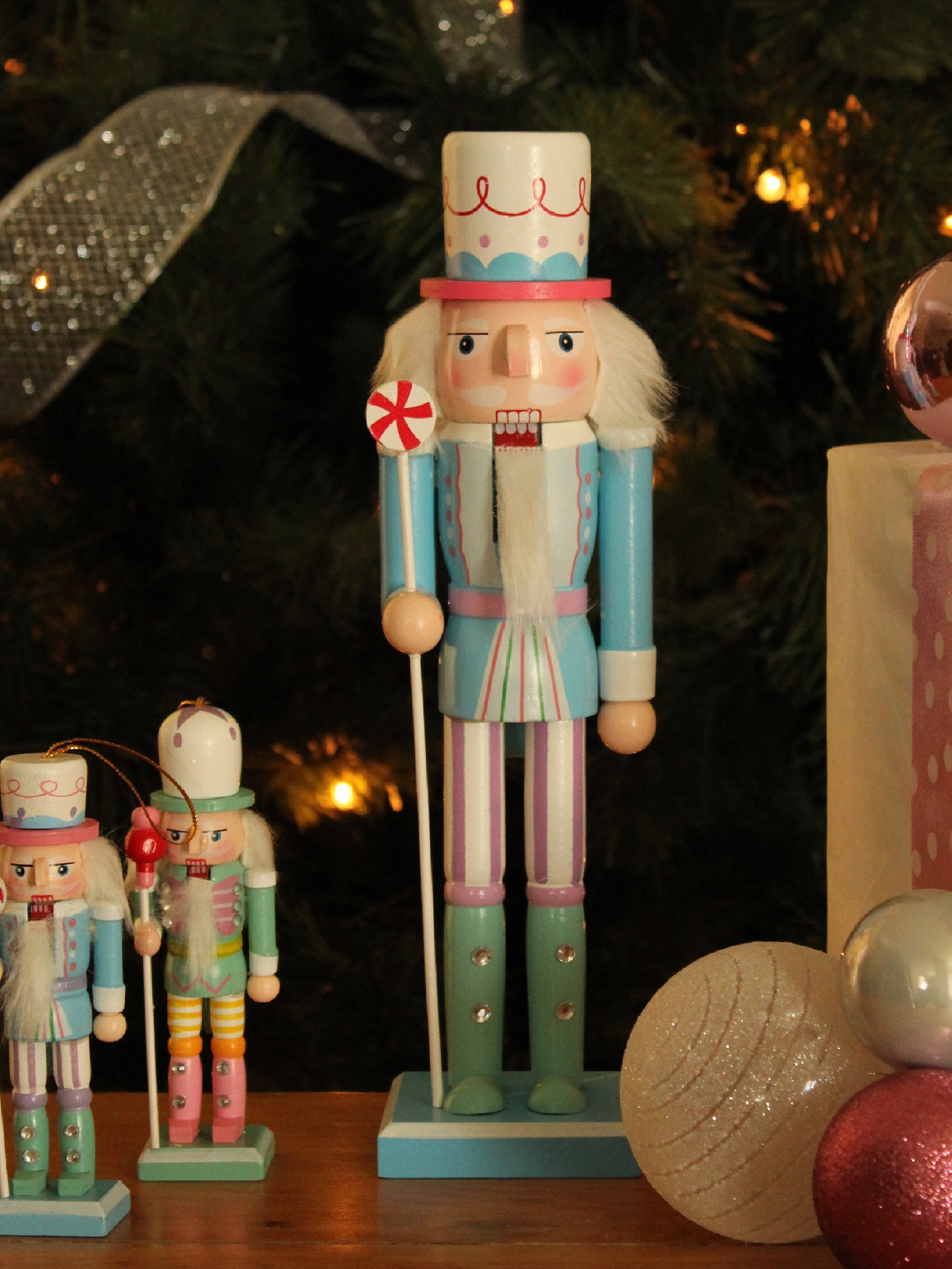 Welcome this Nutcracker to your holiday festivities! This fun wooden figure is a sparkling reminder of the holidays, with its pastel color and royal scepter. Offering a traditional moveable piece for the mouth, he's sure to bring cheer to your home this December! 🎆